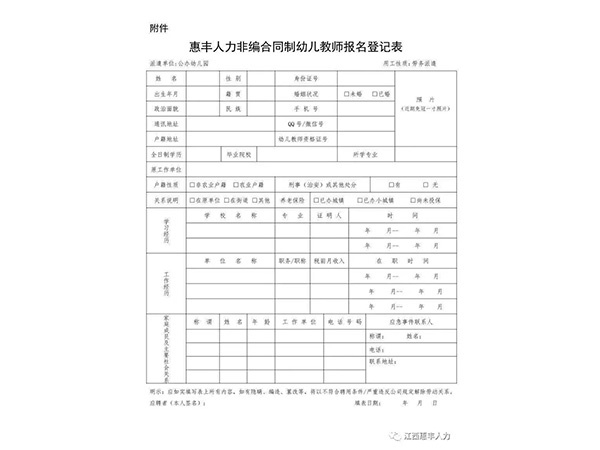 為滿足我市公辦幼兒園師資需求,我公司面向社會公開招聘一大批非事業(yè)編合同制幼兒教師,以勞務派遣的方式與用人單位進行勞動力資源開發(fā)合作。現(xiàn)將有關(guān)事項公告如下:一、招聘人數(shù)及崗位我市招聘非事業(yè)編合同制幼兒教師50名,具體崗位在選崗前公示。二、招聘方式通過第三方勞務公...
